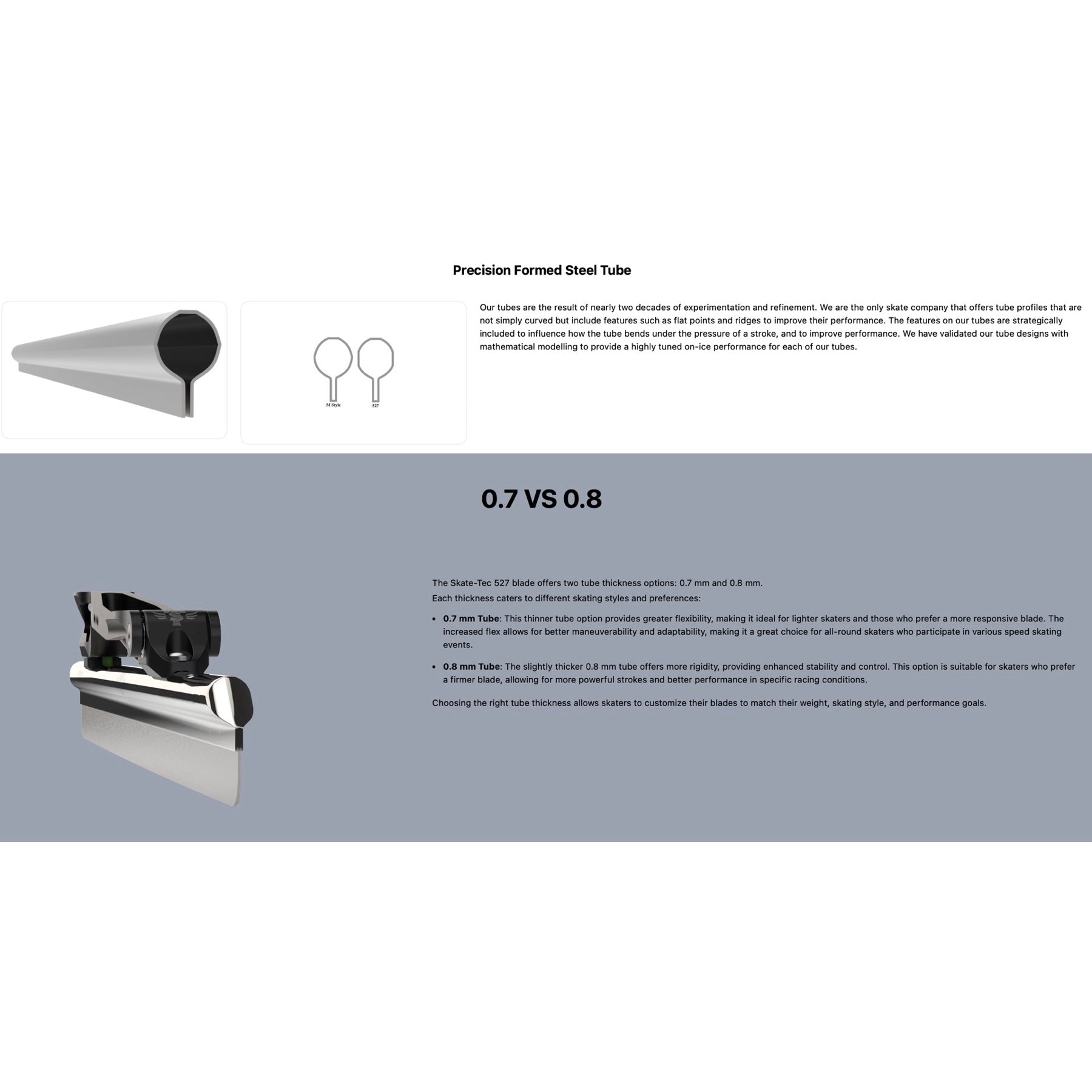 The Skate-Tec 527 blade offers two tube thickness options: 0.7 mm and 0.8 mm.