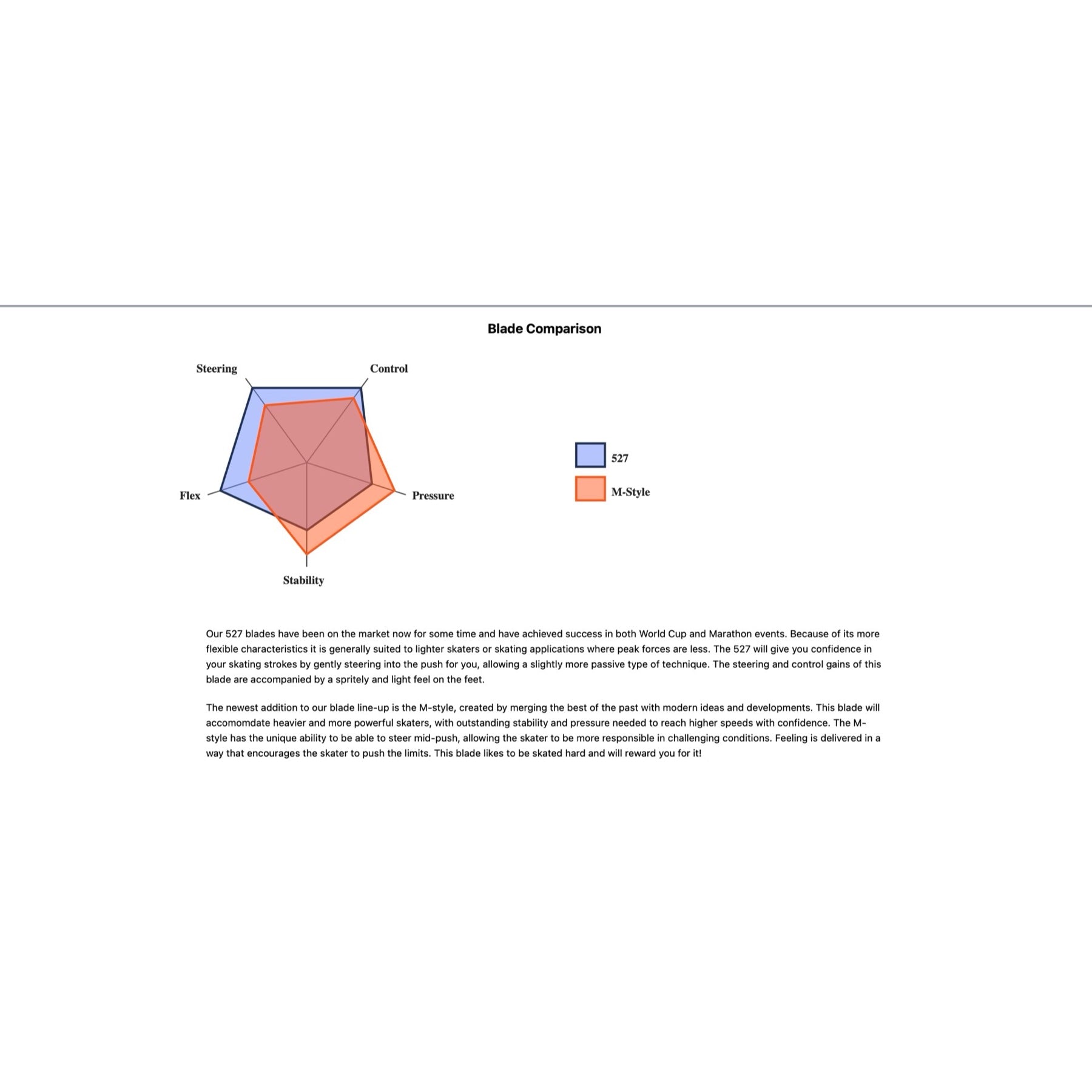 Our 527 blades have been on the market now for some time and have achieved success in both World Cup and Marathon events. Because of its more flexible characteristics it is generally suited to lighter skaters or skating applications where peak forces are less. The 527 will give you confidence in your skating strokes by gently steering into the push for you, allowing a slightly more passive type of technique. The steering and control gains of this blade are accompanied by a spritely and light feel on the feet.