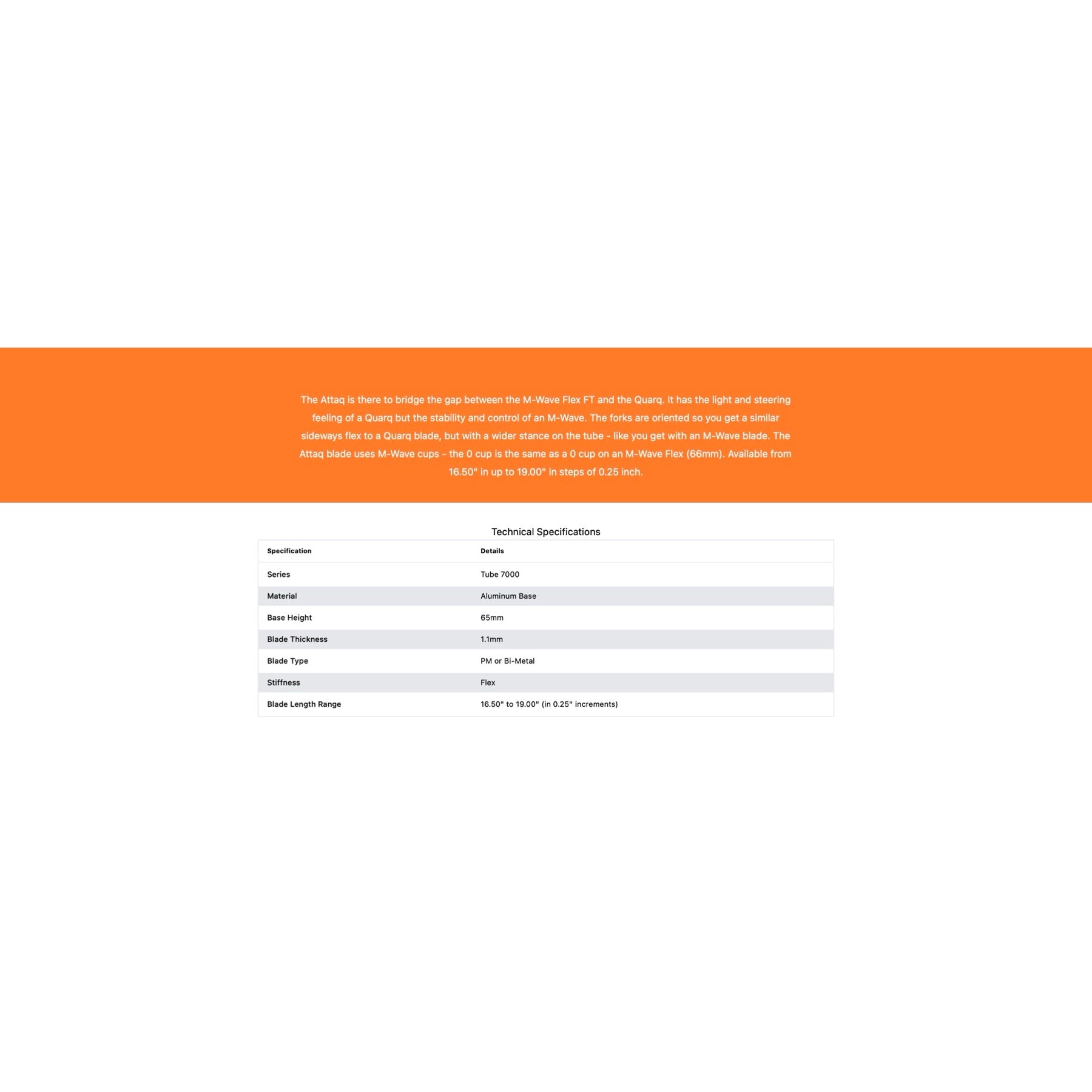 The Attaq is there to bridge the gap between the M-Wave Flex FT and the Quarq. It has the light and steering feeling of a Quarq but the stability and control of an M-Wave. The forks are oriented so you get a similar sideways flex to a Quarq blade, but with a wider stance on the tube - like you get with an M-Wave blade. The Attaq blade uses M-Wave cups - the 0 cup is the same as a 0 cup on an M-Wave Flex (66mm). Available from 16.50" in up to 19.00" in steps of 0.25 inch.