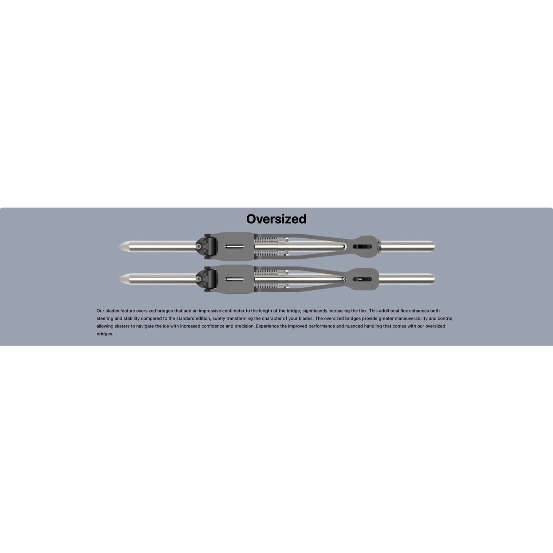 Our blades feature oversized bridges that add an impressive centimeter to the length of the bridge, significantly increasing the flex. This additional flex enhances both steering and stability compared to the standard edition, subtly transforming the character of your blades. The oversized bridges provide greater maneuverability and control, allowing skaters to navigate the ice with increased confidence and precision. Experience the improved performance and nuanced handling that comes with our oversized bridges.